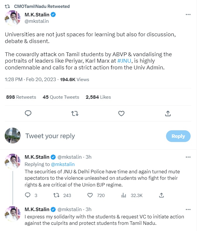 Tamil Nadu Chief Minister condemning the attack on Tamil students has demanded strict action from the JNU administration. In a series of tweets, Stalin writes: “The cowardly attack on Tamil students by ABVP & vandalising the portraits of leaders like Periyar, Karl Marx at JNU, is highly condemnable and calls for strict action from the Univ Admin.”
