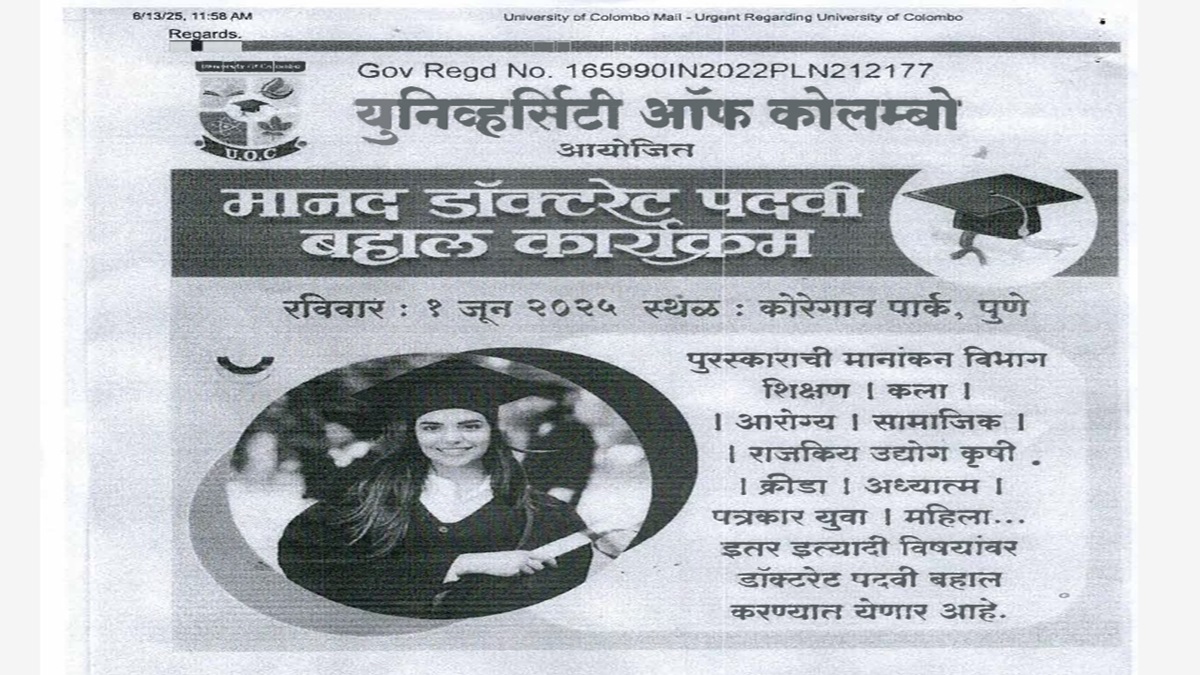 This action was triggered by a fake advertisement—believed to have been circulated in vernacular languages like Marathi—promoting an honorary doctorate event in Pune, Maharashtra. The UGC confirmed that the advertisement was misleading, as the use of the name “University of Colombo” gave a false impression of legitimacy, despite a different logo being used.