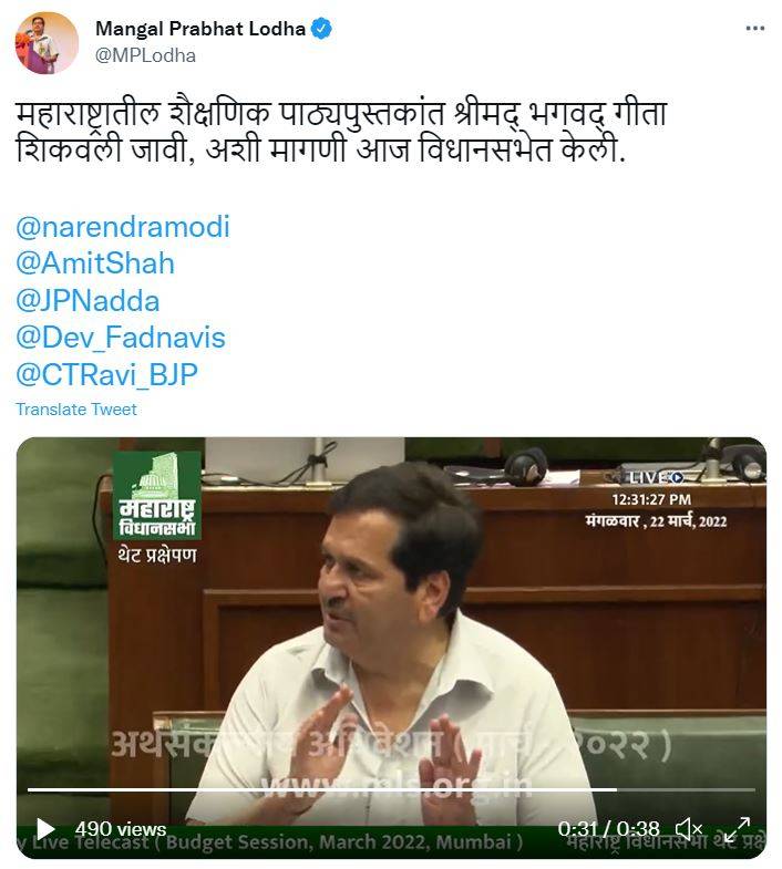 He later tweeted, "Shrimad Bhagwad Gita should be taught in educational textbooks in Maharashtra, demanded in the assembly today".