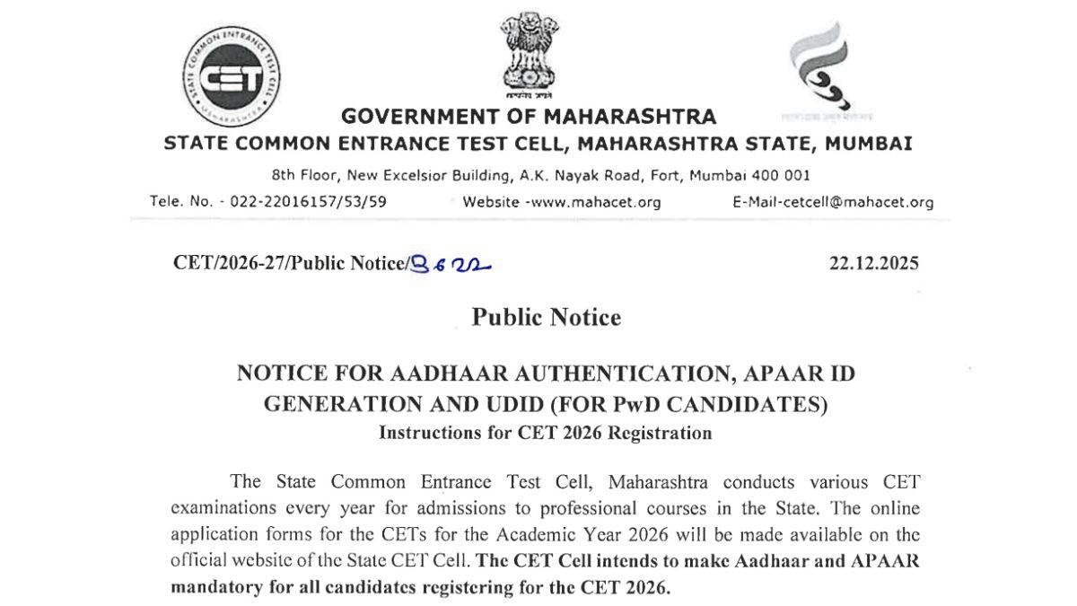 Maharashtra State CET Cell has notified that Aadhaar authentication and APAAR ID generation are required for all candidates registering for MAH BCA CET 2026 and other professional courses under Technical and Higher Education for the 2026-27 academic year. PwD candidates must also submit UDID.