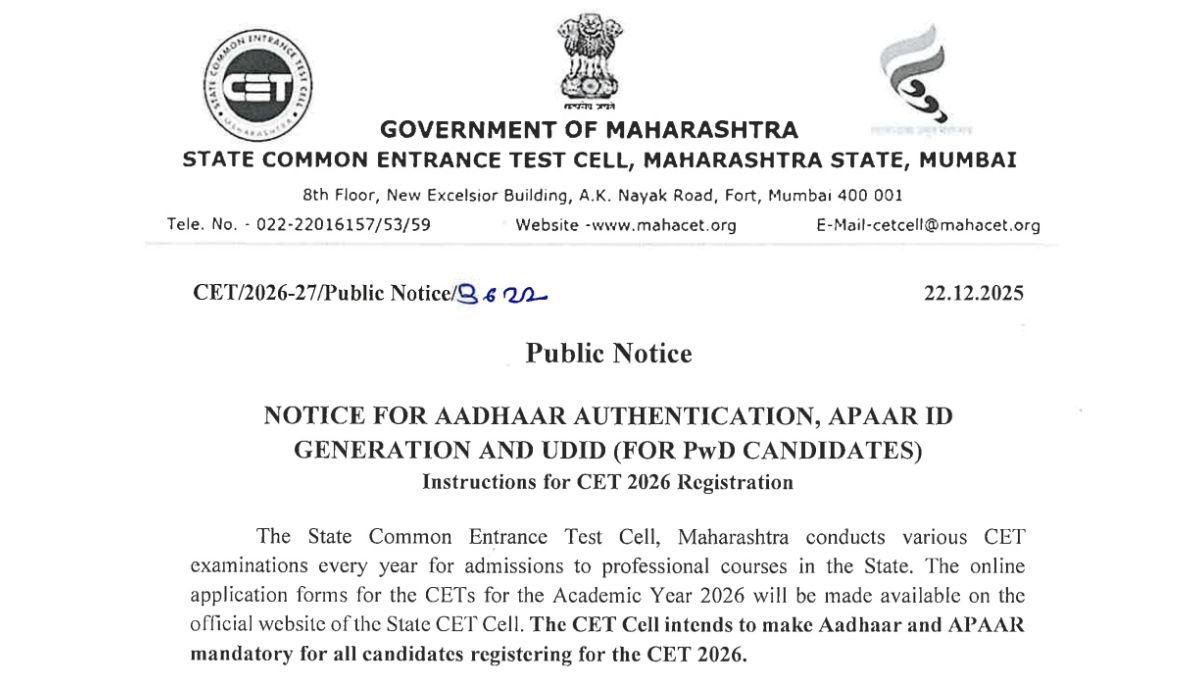 According to the latest notification by the Maharashtra State CET cell, Aadhaar authentication and APAAR ID generation for all candidates, and UDID for PWD candidates, will be mandatory for MAH MCA CET 2026 registrations. Read all details below.