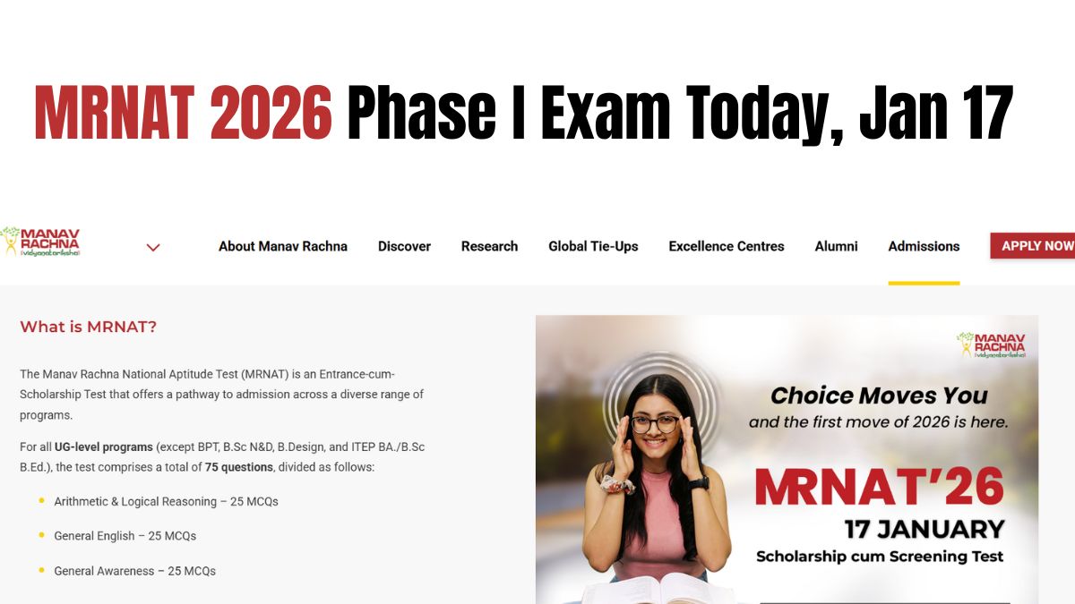 The Manav Rachna National Aptitude Test (MRNAT) 2026 Phase I examination is going to be conducted today, January 17, 2026. It is a scholarship-cum-admission entrance test for students seeking admission to the MCA programme by Manav Rachna institutions.
