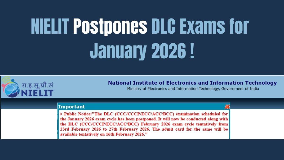 The National Institute of Electronics and Information Technology (NIELIT) has announced the postponement of the DLC examinations for the January 2026 exam cycle. These examinations include CCC, CCCP, ECC, ACC, and BCC courses. The exams will now be conducted from February 23 to 27, 2026.