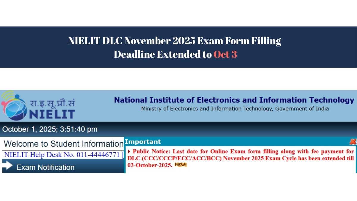 The National Institute of Electronics and Information Technology (NIELIT) has issued a public notice on October 1, 2025, that the last date for filling the online exam form and paying the fee for the DLC (CCC/CCCP/ECC/ACC/BCC) November 2025 Exam Cycle has been extended till October 3, 2025.