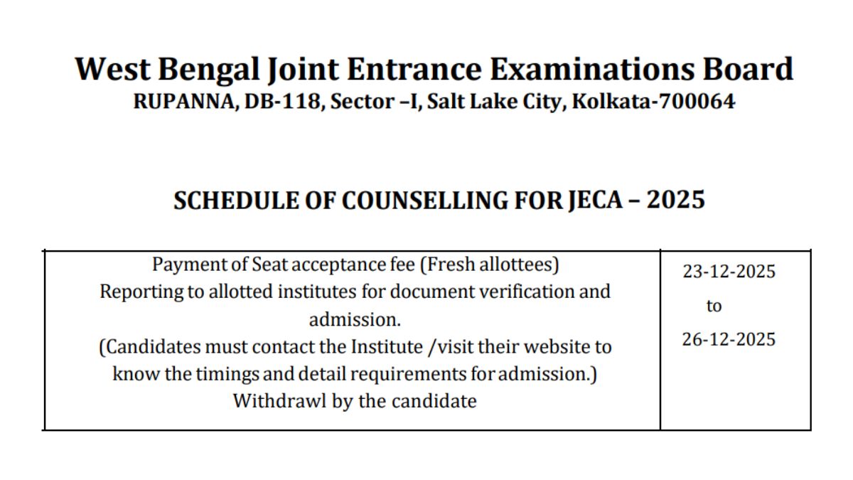 Candidates who have been allotted seats through WBJEE JECA 2025 counselling seat allotment round 2 must complete the seat acceptance process and report to the allotted institute today. This is also the last day for withdrawal from the counselling.