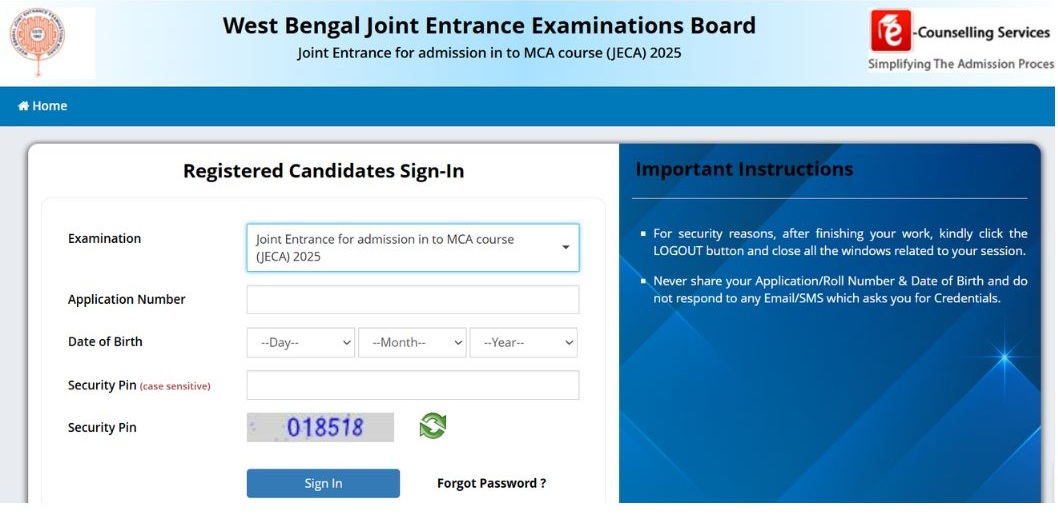 WBJEE JECA 2025 Admit Card Live Updates: Login Page