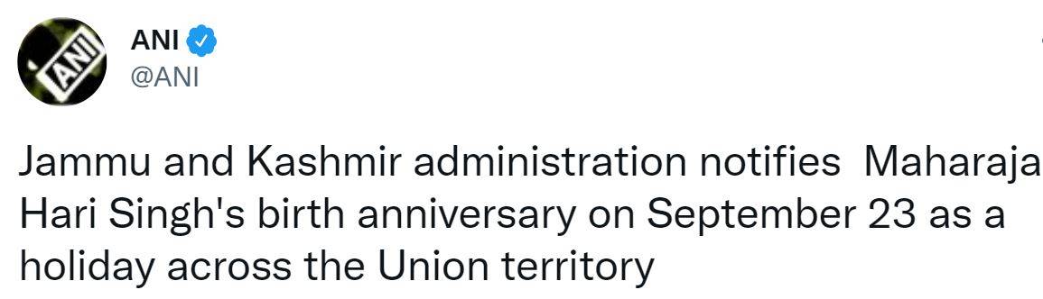 The official notification issued by the Jammu and Kashmir administration informed, "To commemorate the birth anniversary of "Maharaja Hari Singh Ji", 23 of September of every year shall be observed as holiday in Government offices and educational institutions across the Union territory of Jammu and Kashmir under Negotiable Instrument Act, 1881 (Central Act 26 of 1881)."