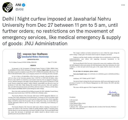 Amid the increasing COVID-19 Omicron scare and following the guidelines issued by Delhi government, the Jawaharlal Nehru University has imposed night curfew on its campus from December 27. According to the official JNU circular, the curfew at the campus will be imposed from 11 PM to 5 AM. "No restrictions on the movement of emergency services, like the medical emergency and supply of goods," the circular read.