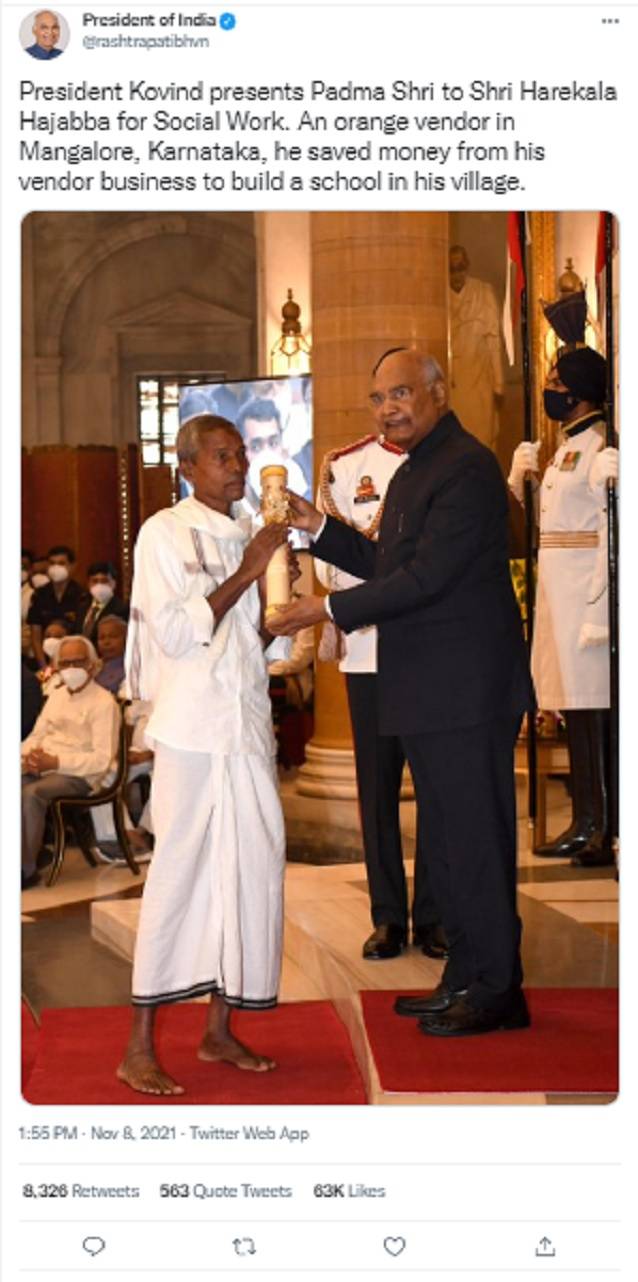 A 68-year-old fruit seller from Mangalore in Karnataka, Harekala Hajabba, has been awarded India's fourth-highest civilian award, the Padma Shri, from President Ram Nath Kovind for building a primary school with his earnings of Rs 150 per day.