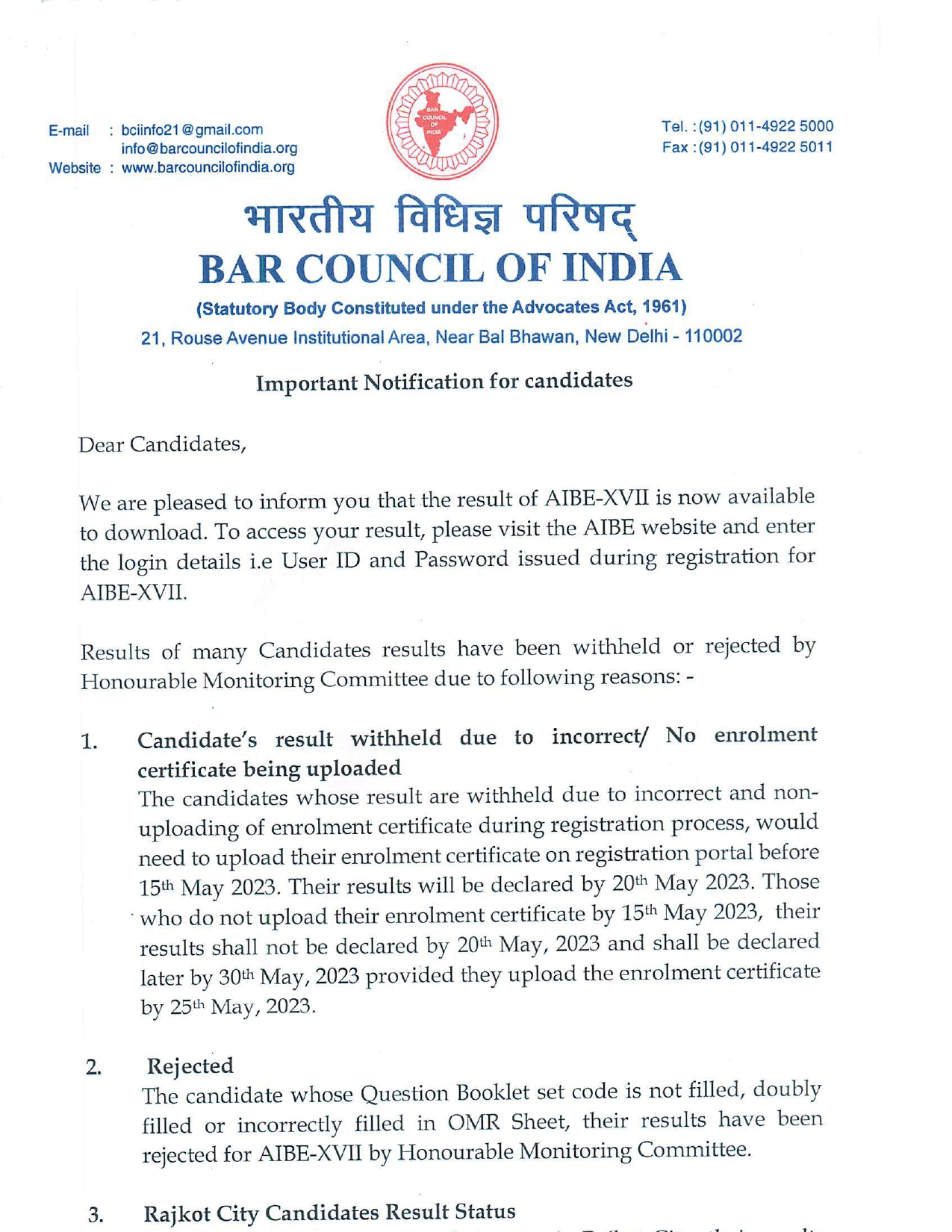 The Bar Council of India has declared results of AIBE XVII around 7:30 but with a few clause i.e. WITHHELD/REJECTED status. The exam authority has informed candidates the reason why their results were WITHHELD/ REJECTED in an another notificaiton. Moreover, the results of candidates who took AIBE 17 at test centres in Rajkot city are also WITHHELD until the monitoring committee arrives at a final decision. Read here the exact reasons, how to rectify WITHHELD result errors so that BCI can release their results, schedule, as well as what needs to done for Rejected Result status.