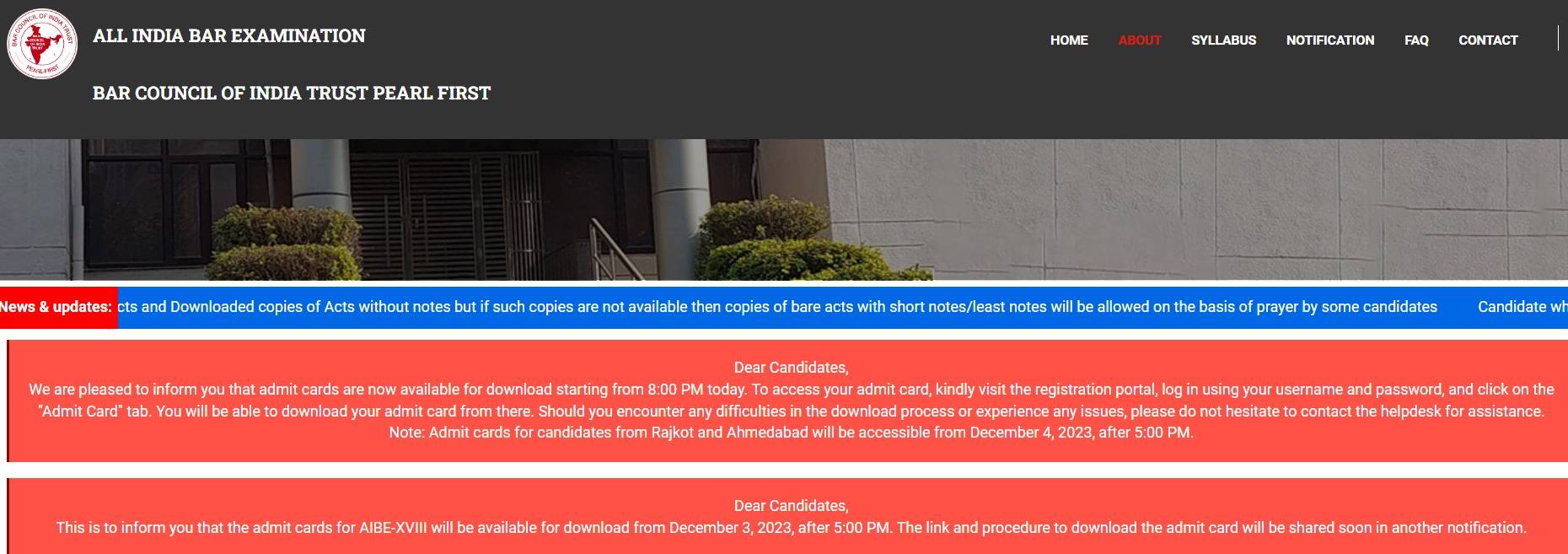 AIBE 18 (XVII) Admit Card: The Bar Council of India (BCI) has announced that it will release the All India Bar Examination (AIBE) 18 admit card 2023 today i.e.; December 3 after 8 pm. However, for the Admit cards for candidates from Rajkot and Ahmedabad will be accessible from December 4, 2023, after 5:00 PM. The AIBE 18 Exam Date is December 10, 2023. Candidates have been waiting for BCI to release the AIBE Hall Ticket 2023. BCI was supposed to release AIBE 18 Admit Card from December 1 to 5, 2023. However, later it revised admit card dates for AIBE 18.