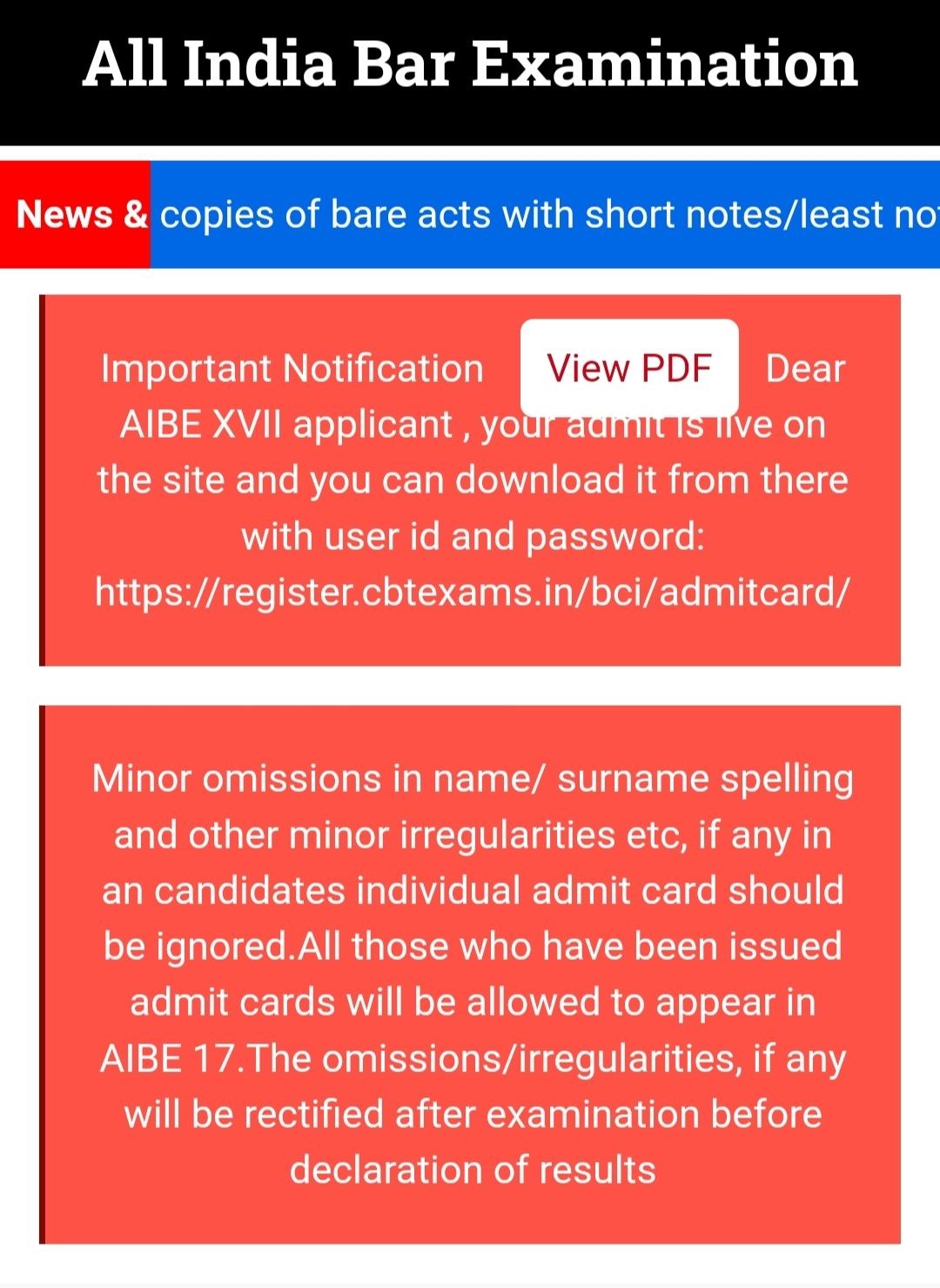 The exam authority informed that, "Minor omissions in name/ surname spelling and other minor irregularities etc, if any in an candidates individual admit card should be ignored. All those who have been issued admit cards will be allowed to appear in AIBE 17. The omissions/irregularities, if any will be rectified after examination before declaration of results"