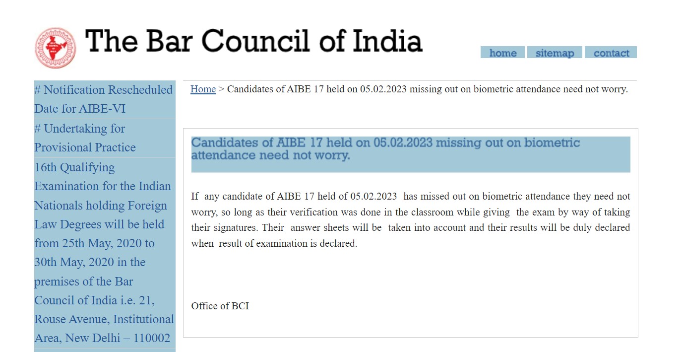Addressing the issue, BCI stated, "If any candidate of AIBE 17 held of 05.02.2023 has missed out on biometric attendance they need not worry, so long as their verification was done in the classroom while giving the exam by way of taking their signatures.Their answer sheets will be taken into account and their results will be duly declared when result of the examination is declared."