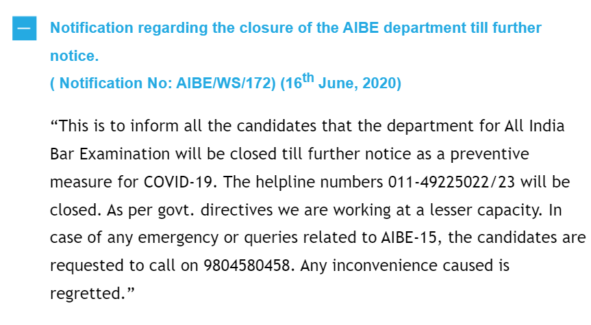 This is to inform all the candidates that the department for All India Bar Examination will be closed until further notice as a preventive measure for COVID-19. The helpline numbers 011-49225022/23 will be closed. As per govt. directives we are working at a lesser capacity. In case of any emergency or queries related to AIBE-15, the candidates are requested to call on 9804580458. Any inconvenience caused is regretted.”