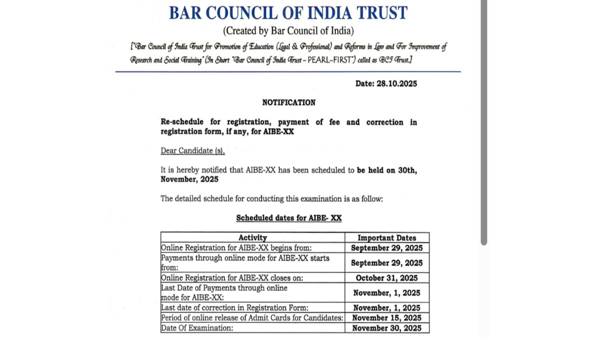 The Bar Council of India has released a notification of revised AIBE application schedule. Interested candidates can now apply for the exam until 31-Oct-2025 on the official website; i.e. allindiabarexamination.com.