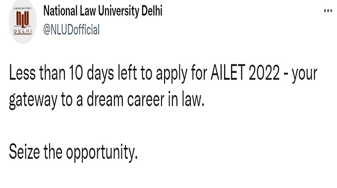 National Law University Delhi tweeted, "Less than 10 days left to apply for AILET 2022 - your gateway to a dream career in law. Seize the opportunity."
