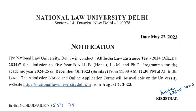 NLU Delhi has announced the exam date for All India Law Entrance Test 2024 for admission to BA LLB and LLM course. The online applications will begin from August 7 onwards. Check notification here.