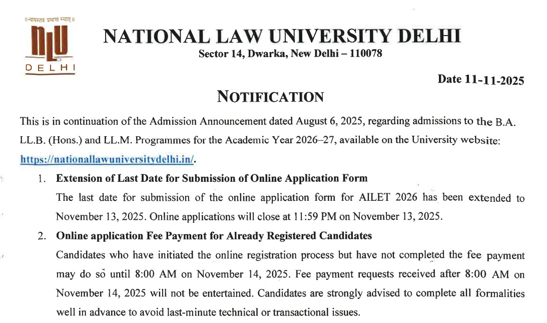 Read More: AILET 2026 Registration Last Date Extended to Nov 13, Application Correction till Nov 14