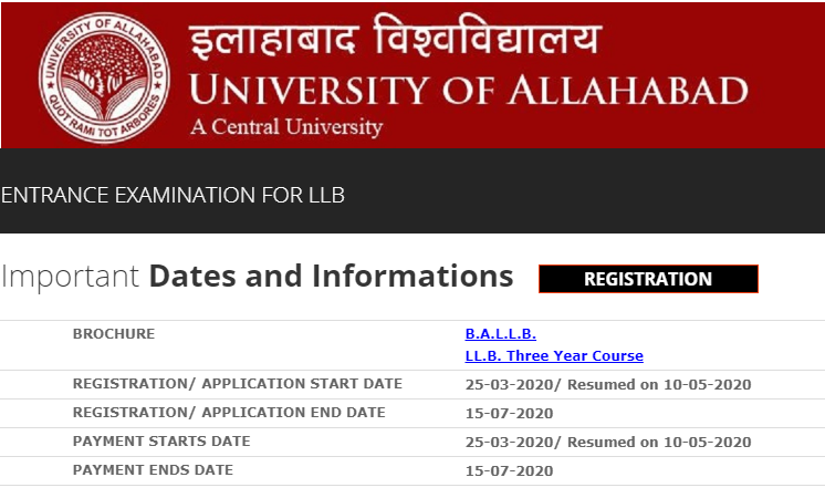 The last date of Registration/application/fees payment for admission to all the courses of study at the University of Allahabad will be 30th June 2020. The last date of application may further be changed based on Government advisory to prevent the spread of COVID-19 (CORONA) Pandemic.