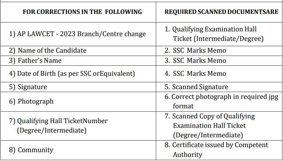 Check out the documents required for changes in the specific details mentioned on the AP LAWCET / AP PGLCET 2023 applications:
