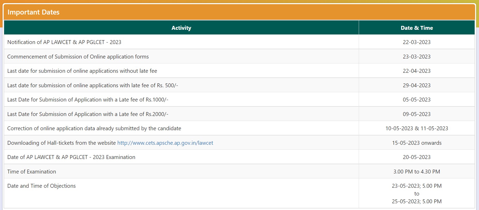 Check out the AP LAWCET 2023 important dates and application fees according to the time of submission of the APLAWCET application form 2023:
