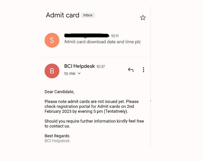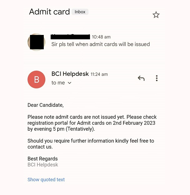 Earlier, as candidates were writing to the BCI helpdesk for application corrections, exam centre related changes, and other details. BCI has responded to candidates with respect to AIBE Admit Card availability (date and time). In this email the exam authority has informed rescheduling of AIBE 2023 admit card release date. The exam authority wrote in the email "Dear Candidate, Please note admit cards are not issued yet. Please check registration portal for Admit cards on 2nd February 2023 by evening 5 pm (Tentatively). Should you require further information kindly feel free to contact us.