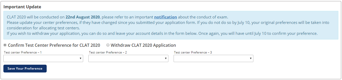 CLAT 2020 will be conducted on 22nd August 2020, please refer to an important notification about the conduct of exam. Please update your center preferences, if they have changed since you submitted your application form. If you do not do so by July 10, your original preferences will be taken into consideration for allocating test centers. If you wish to withdraw your application, you can do so and leave your account details in the form below. Once again, you will have until July 10 to confirm your preference.