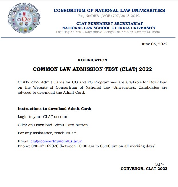 The official notification released for CLAT 2022 admit card on June 6 stated, “CLAT- 2022 Admit Cards for UG and PG Programmes are available for Download on the Website of Consortium of National Law Universities.