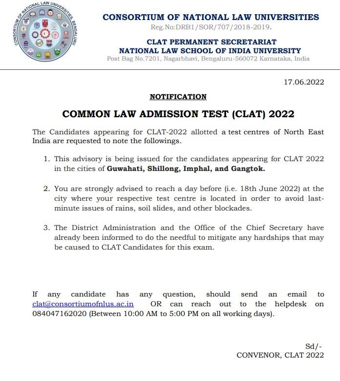 The notification released on June 17 stated, โThe Candidates appearing for CLAT-2022 allotted test centres of North East India are requested to note the following.ย