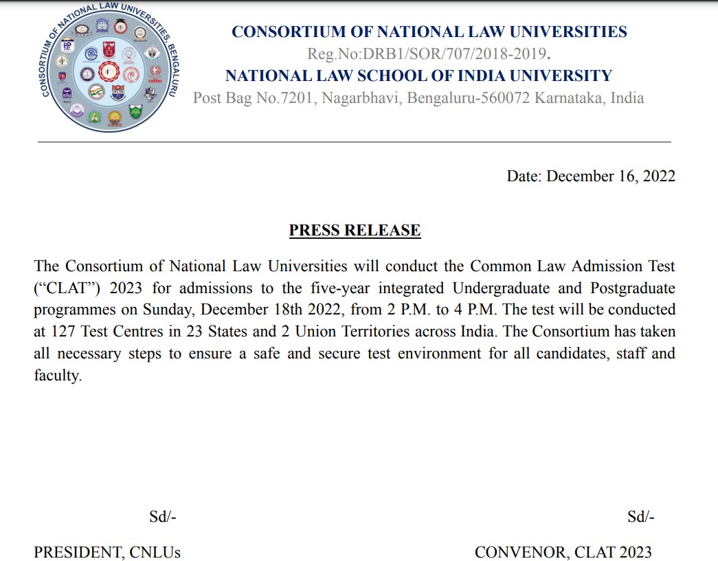 The consortium of NLUs has published a press release for CLAT 2023 exam day. Check below: