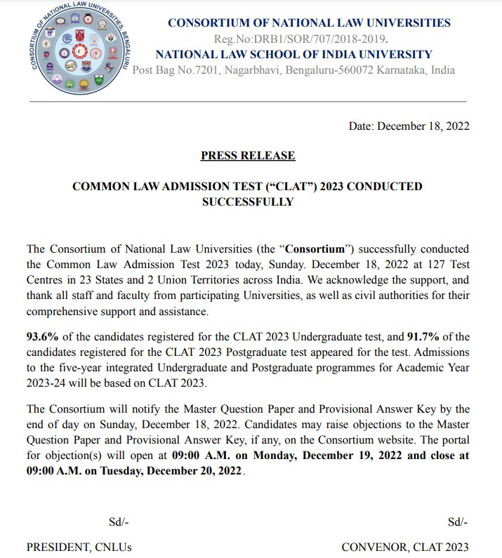 The exam authority also extended thanks to the test centres and supporting staff for managing the conduct of CLAT 2023 across the allotted test centres by stating, "The Consortium of National Law Universities (the “Consortium”) successfully conducted the Common Law Admission Test 2023 today, Sunday. December 18, 2022 at 127 Test Centres in 23 States and 2 Union Territories across India. We acknowledge the support, and thank all staff and faculty from participating Universities, as well as civil authorities for their comprehensive support and assistance."