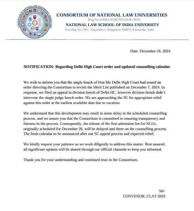 "We understand that this development may result in some delay in the scheduled counselling process, and we assure you that the Consortium is committed to ensuring transparency and fairness in the process. Consequently, the release of the first admission list for NLUs, originally scheduled for December 26, will be delayed and there on the counselling process. The fresh calendar to be announced after our SC appeal process and expected relief," the notification added.