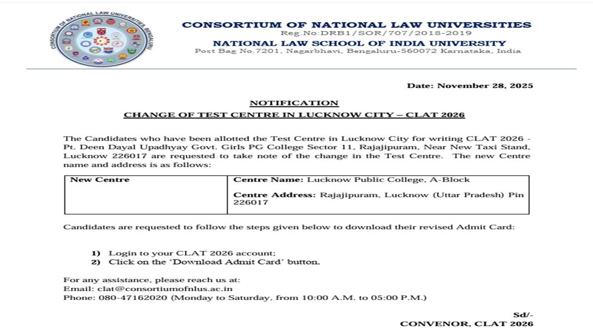 The Consortium of NLUs has released an important notification for aspirants. CLAT 2026 is scheduled to be held on December 7, 2025. The exam timing is 2 pm to 4 pm. As per the official CLAT Notification, those who have been allotted the Test Centre in Lucknow City for writing CLAT 2026 at Pt. Deen Dayal Upadhyay Govt. Girls PG College Sector 11, Rajajipuram, Near New Taxi Stand, Lucknow 226017 is requested to take note of the change in the Test Centre.Β