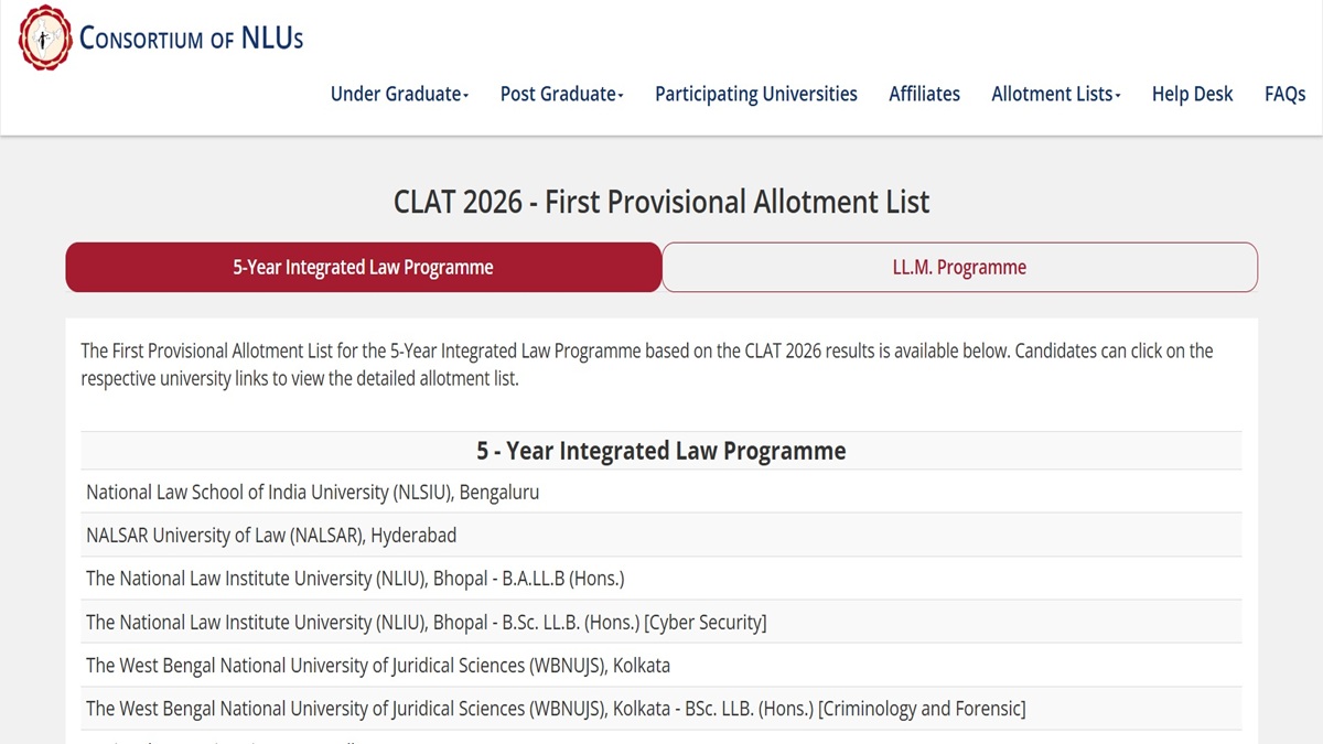 CLAT Counselling 2026: The Consortium of National Law Universities (NLUs) has released the Common Law Admission Test First Merit List. Candidates can check the seat allotment list by visiting consortiumofnlus.ac.in. Candidates must note that the CLAT 2026 First Seat Allotment List has been released separately for each NLUs. CLAT 2026 was held on December 7, 2025.