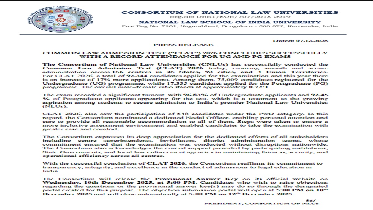 The Consortium of NLUs will open the CLAT Objection Window on December 10, 2025 at 5 pm.