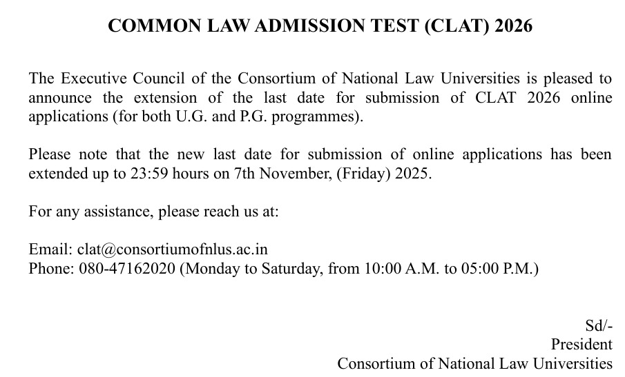 The consortium has released the revised notification for the CLAT 2026 on the Consortium of NLUs website. The candidates who missed the deadline can now apply for the exam until 07-Nov-2025.