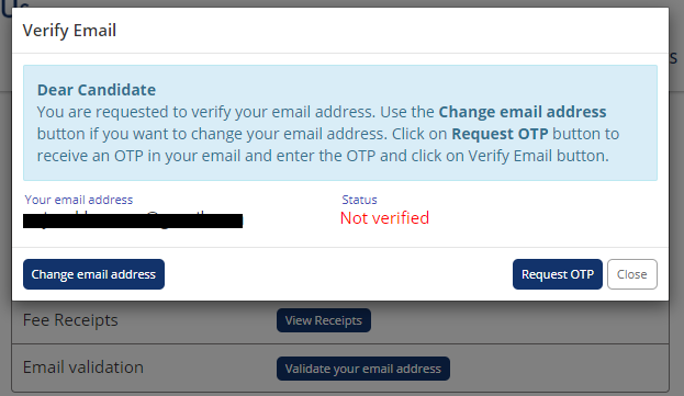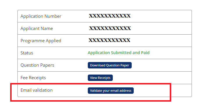 To verify the email address, candidates need to login to their application account and click on 'Validate Email' button given as under:
