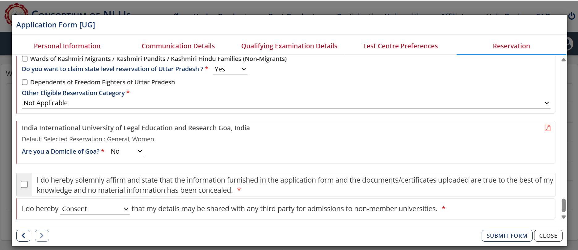 The candidates will have to select the reservation in their preferred NLU for admission. This selection will be used during the selection process. Once you select the reseration, submit the CLAT 2026 application form after declaring your consent.