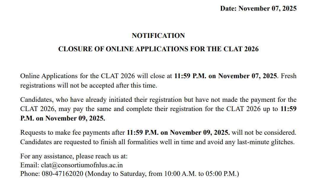 Candidates who have already registered but could not pay the fee will be able to pay the CLAT 2026 registration fee until 09-Nov-2025.