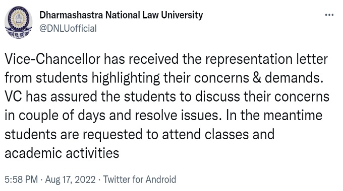 Dharmashastra National Law University tweeted, "Vice-Chancellor has received the representation letter from students highlighting their concerns & demands. VC has assured the students to discuss their concerns in a couple of days and resolve issues. In the meantime, students are requested to attend classes and academic activities."