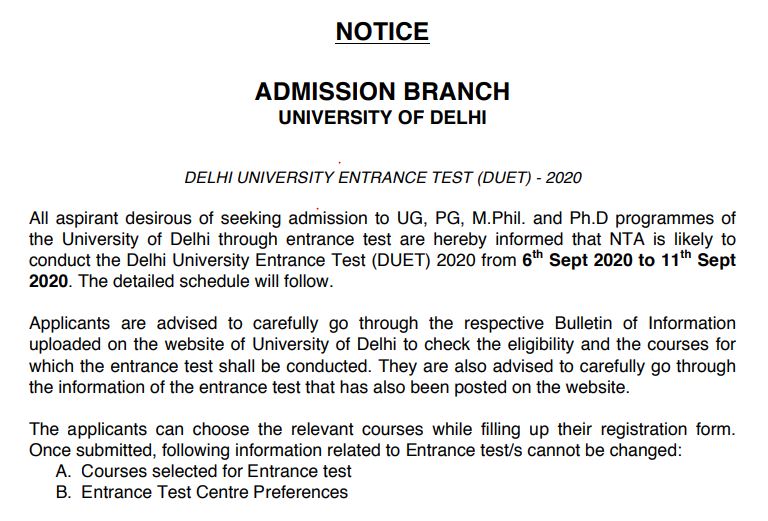The official notification released by DU stated, "All aspirant desirous of seeking admission to UG, PG, MPhil and PhD programmes of the University of Delhi through entrance test are hereby informed that NTA is likely to conduct the Delhi University Entrance Test (DUET) 2020 from 6th Sept 2020 to 11th Sept 2020. The detailed schedule will follow.