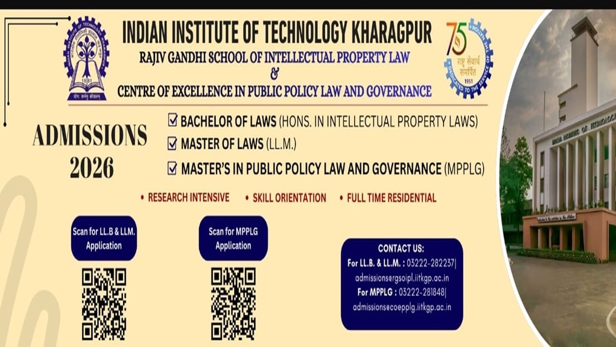 The Indian Institute of Technology Kharagpur (IIT Kharagpur) has opened online applications for admission to its specialised law and public policy programmes for the 2026 academic session. The institute is inviting applications for LL.B. (Honours in Intellectual Property Law), LL.M., and the Master’s in Public Policy, Law and Governance (MPPLG) programmes.