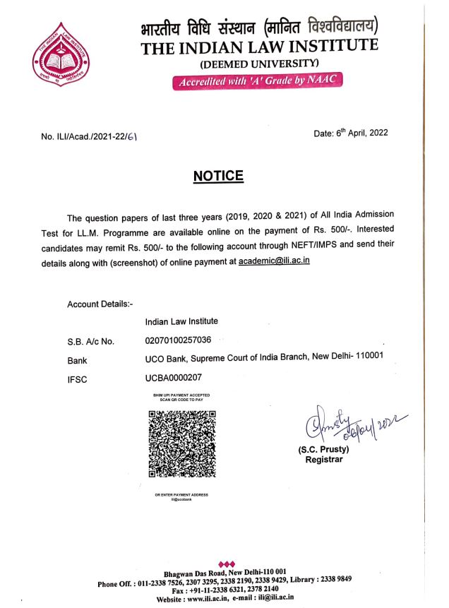 As per the notification released by ILI, โThe question papers of last three years (2019, 2020 & 2021) of All India Admission Test for LL.M. Programme are available online on the payment of Rs. 500/-, Interested candidates may remit Rs. 500/- to the following account through NEFT/ IMPS and send their details along with (screenshot) of online payment at academic@ili.ac.inโ