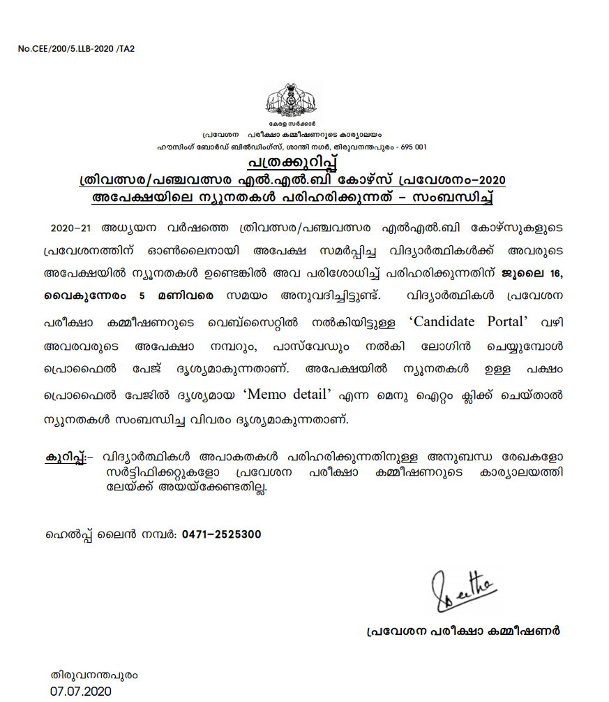 The Commissioner of Entrance Exam, Kerala has extended the details rectification for the KLEE 2020 three-year LLB and five-year LLB courses. Candidates who appeared for KLEE 2020 have been given chance for memo rectification in their three-year LLB or the five-year LLB course until July 16. They can log in on the official website of KLEE 2020 to rectify their details and, update correct details.