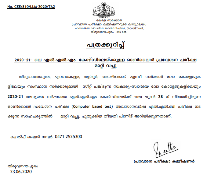 The Commissioner of Entrance Exams (CEE), Kerala has postponed the entrance exam for LLM courses owing to worsening conditions of COVID-19 pandemic. The exam was scheduled to be released on The admit card of KLEE LLM 2020 was scheduled to be released on June 23, instead, the exam authority published a notification for postponing the examination. The application window of KLEE LLM 2020 has been deactivated as well. The exam authority will now release a fresh notification for KLEE LLM 2020.