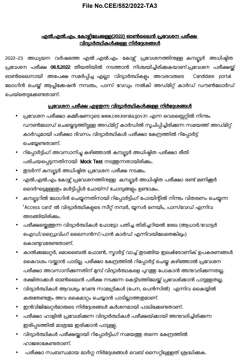 CEE Kerala also informed candidates for the exam day as under: