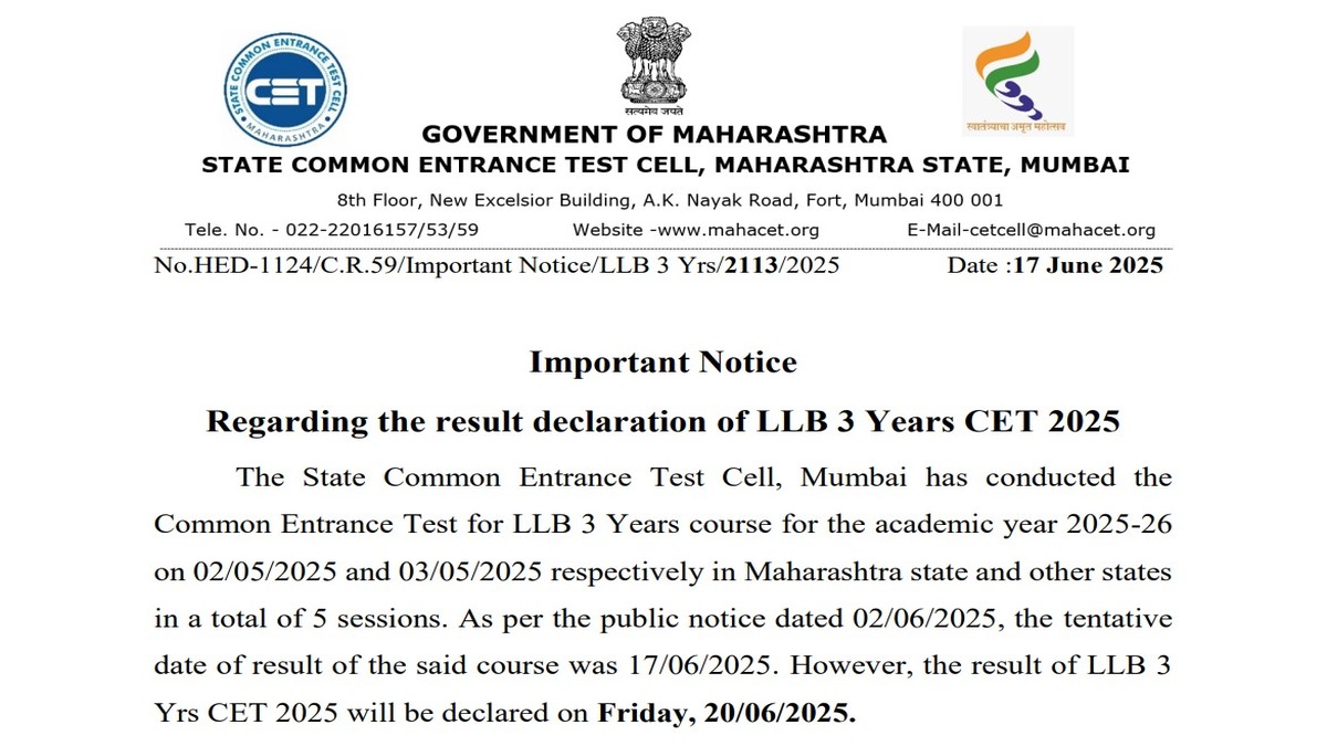 As per the new notification by MAH CET Cell, the MH CET Law 3-year LLB result will now be announced tentatively on June 20, 2025.