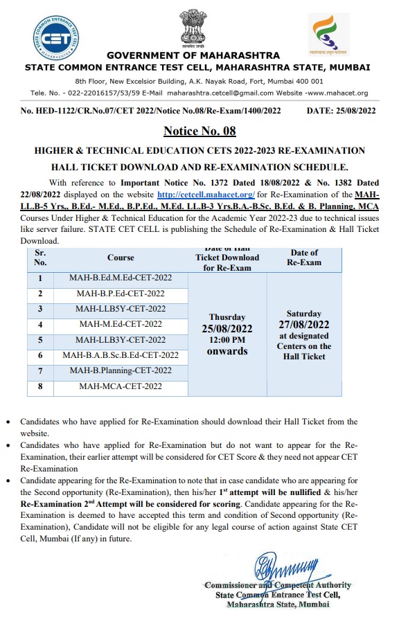 The Common Entrance Test Cell has released the admit card for MH CET Law 2022 re-take exam. The exam will be held on August 27 for the candidates who registered for a re-take examination owing to technical issues at their test centres.
