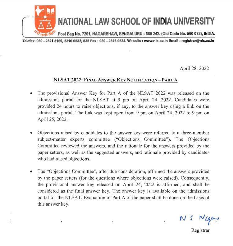 The "Objections Committee", after due consideration, affirmed the answers provided by the paper setters (for the questions where objections were raised). Consequently, the provisional answer key released on April 24, 2022 is affirmed, and shall be considered as the final answer key. The answer key is available on the admissions portal for the NLSA T. Evaluation of Part A of the paper shall be done on the basis of this answer key.”