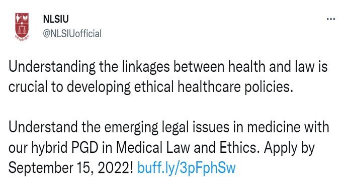NLSIU tweet reads, "Understanding the linkages between health and law is crucial to developing ethical healthcare policies. Understand the emerging legal issues in medicine with our hybrid PGD in Medical Law and Ethics. Apply by September 15, 2022!"
